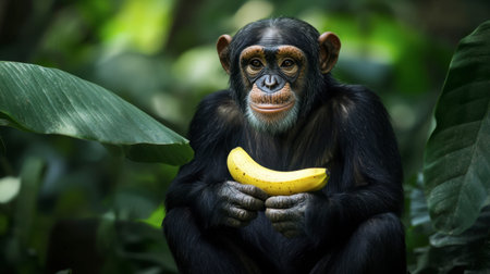 A charming chimpanzee sits amidst lush greenery, holding a banana. Its curious and serene expression captures the beauty of wildlife in nature.
