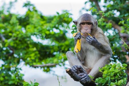 A monkey is eating a banana is on the tree Which these monkey lives at Sam Muk mountain.People and tourist like to give a fruit. Location Bangsan district Cholburi province ,Thailand
