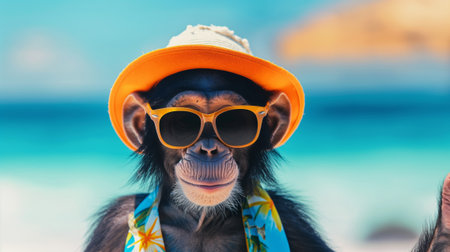 A playful anthropomorphic chimpanzee dressed in stylish beachwear, complete with sun hat and sunglasses, against a vibrant ocean backdrop