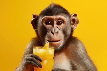 Cute monkey holding beverage glass on yellow background. Generative AI