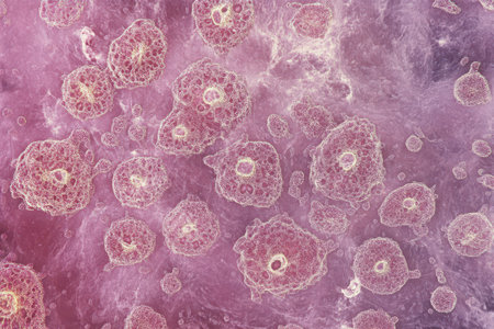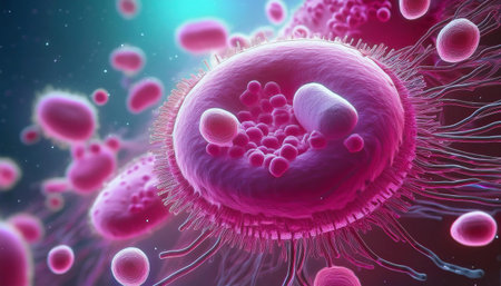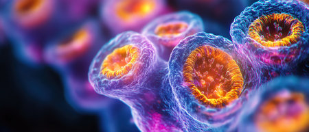 Colorful view of cellular structures captured at a microscopic level showcasing various shapes and sizes in a vibrant environment.
