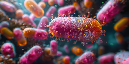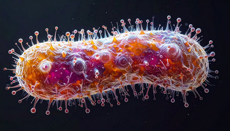 A close-up 3D rendering of a rod-shaped bacterium with a textured, orange and purple surface covered in numerous small, spike-like appendages...