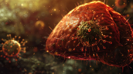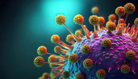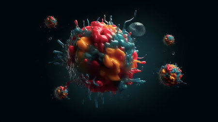 An abstract close-up of a virus attacking a cell, visualized with vibrant colors and intricate details. The image evokes a sense of both beauty and danger, highlighting the microscopic world where life and death collide.