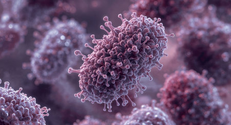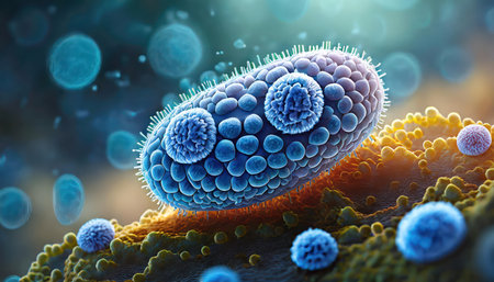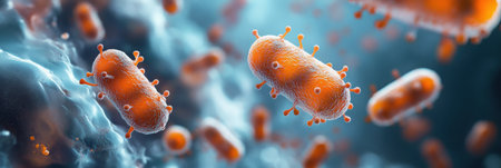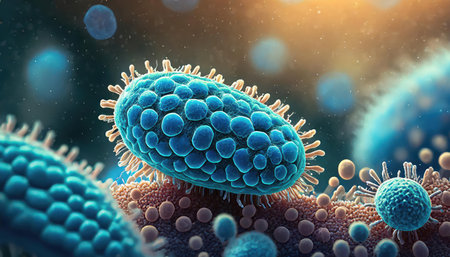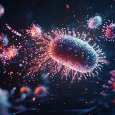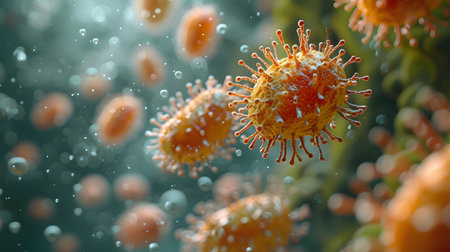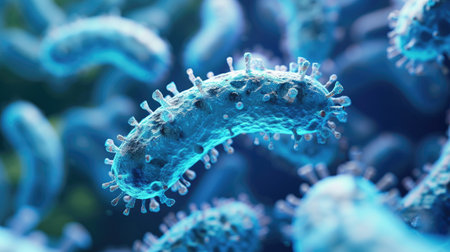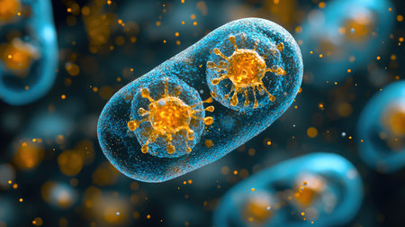 Close-up view of glowing bacteria and viruses with spiky exteriors, floating in a dark blue, luminous, and abstract background.
