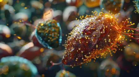 A microscopic view of intricate bacteria, surrounded by a vibrant and enigmatic environment, showing the unseen beauty and complexity of microscopic life forms.