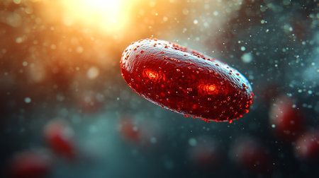 This macro image showcases red and blue spherical cells suspended in an abstract scientific background, ideal for themes of biology, health, and microscopic research.