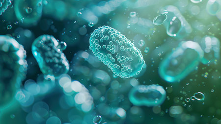 A captivating 3D illustration of aqua-colored probiotic bacteria, showcasing their unique shapes and detailed textures.