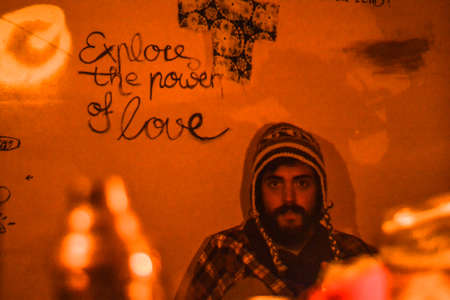 Conceptual art portrait of spooky weird beautiful handsome young middle east brunette blue eyes man face with beard, wearing blue hoodie, looking in camera