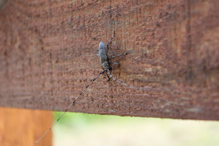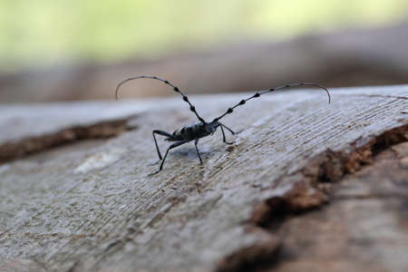 beetle with long mustache sits on a wooden Board looking down. the Capricorn beetle sits on the Board on a forest background.