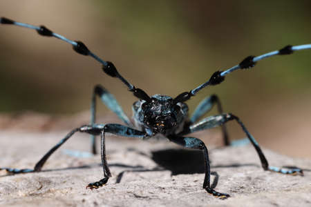 Beetle barbel, large black whiskered beetle, close-up, blur background