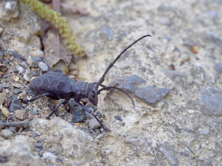 Closeup on beetle Monochamus sartor on the asphalt.