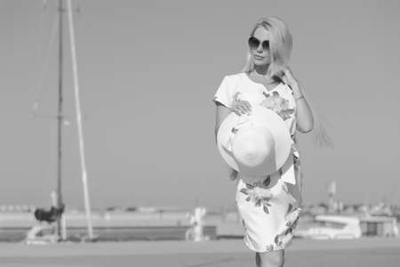 Summer, happiness and lifestyle concept. Lovely blonde girl in sunglasses relaxing outdoor against blue sky, wide angle unusual view