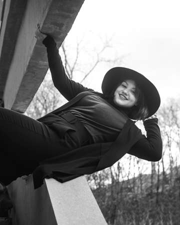 Brunette woman in hat sits and enjoys on the stairs of building in city. Plus size model. Black and white
