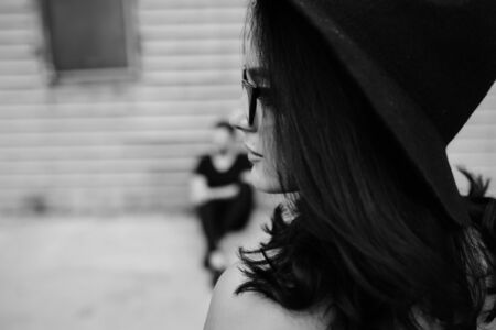 young luxury woman posing at city with looking at camera monochrome