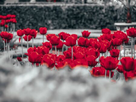 Garden of Eden. Toned image. Garden flowers. Colorful Spring Tulips. Panoramic landscape with multicolor spring flowers in park. Nature background. copy space