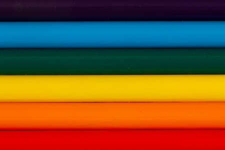 Children's pencils for drawing in the form of the LGBT rainbow flag. Beautiful rainbow of colorful pastel pencils for baby. LGBT Pride Month. LGBTQIA colors. Close Up. Top view