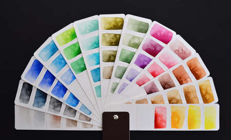 Watercolor color palette on white paper, fanned out. On a black background. A table of different shades of colors for mixing and matching, an empty space for text.