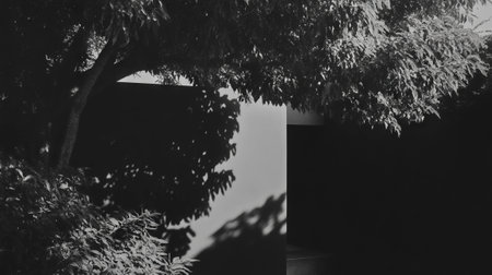 Subtle shadows on deep black wall with foliage in monochrome scene
