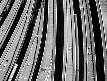road stud reflector marker on concrete road with traffic line in black and white tone