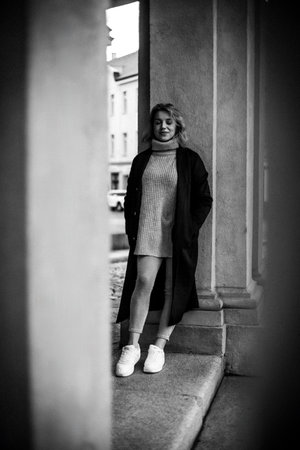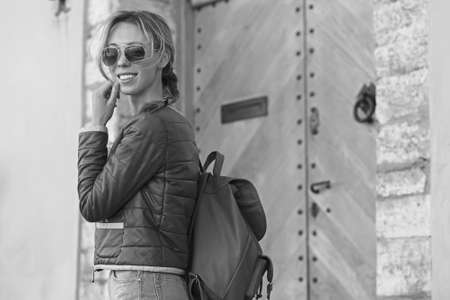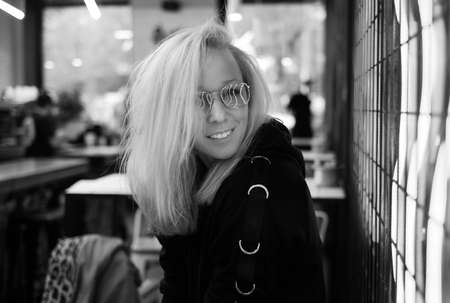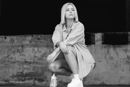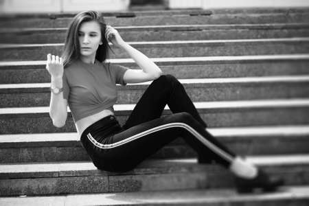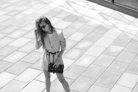 A monochrome portrait of a young fair-haired walking in open air. Casual fashion, beauty.