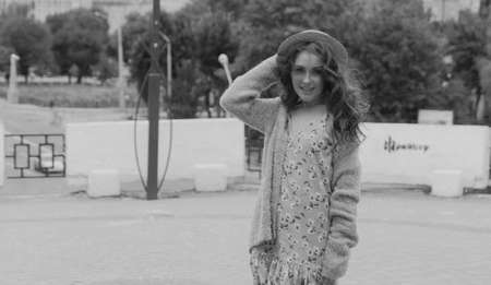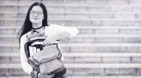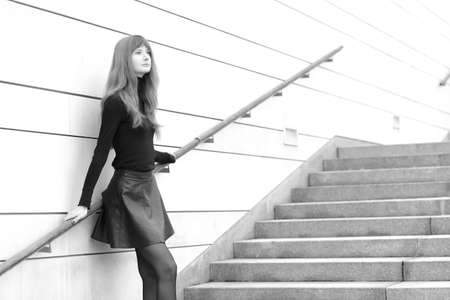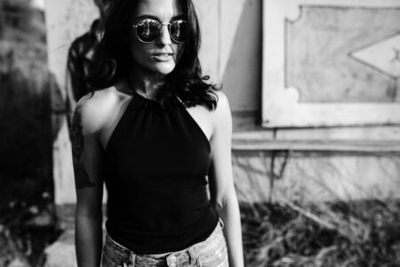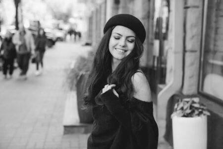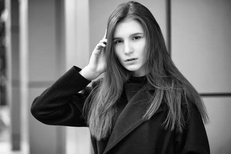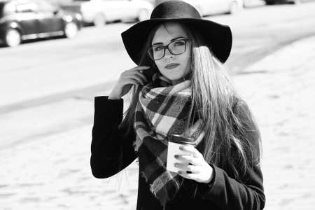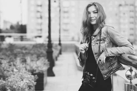 Portrait of young beautiful hipster woman in the city streets in black and white
