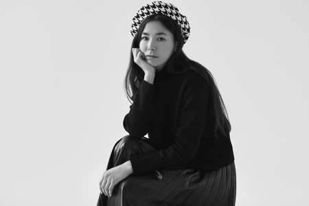 Gorgeous portrait of elegant asian woman in fashionable black skirt and beret isolated on white background