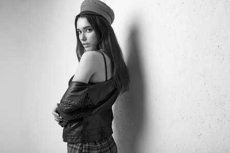 casual young woman holding leather jacket over shoulder, posing and standing on black and white background in studio
