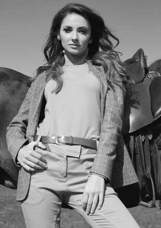 Portrait of a gorgeous brunette woman in an elegant checkered brown jacket posing with a horse on country landscape
