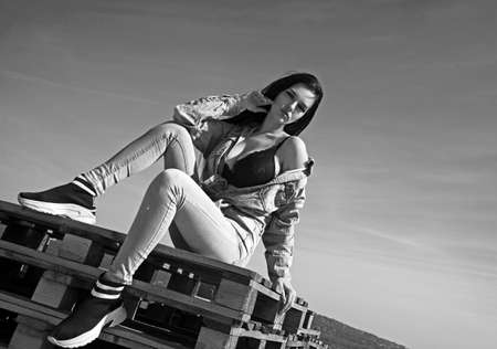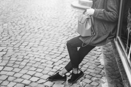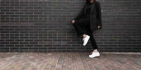 Cool girl in fashion denim pants in leather stylish sneakers in trendy jacket with black handbag standing on one leg near brick wall in city. Close up female body. Fashionable casual youth woman's wear
