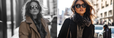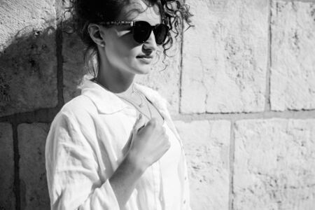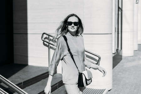 Stylish black-white photo young elegant woman in fashionable sunglasses in vintage coat with trendy handbag near wall on sunny day. Girl in fashion clothes stands near building in city. retro style.