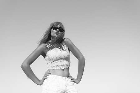Summer, happiness and lifestyle concept. Lovely blonde girl in sunglasses relaxing outdoor against blue sky, wide angle unusual view