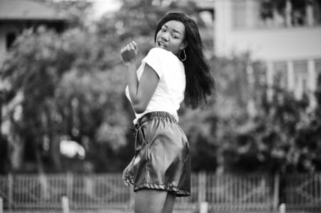 African american dark skinned slim model posed in a black leather shorts and white t-shirt.