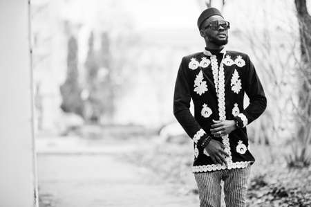 Mega stylish african man in traditional jacket pose. Fashionable black guy in hat and sunglasses.