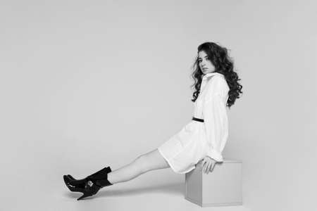 Young beautiful brunette woman in stylish casual clothing, hat and high heels boots sitting on floor with legs stretched out over white wall background. Stylish look and footwear concept