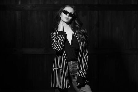 Studio portrait of fashionable young woman in male style clothes posing against dark background. Straight hair, sunglasses, grey jeans, black blouse and striped jacket. Vogue style.