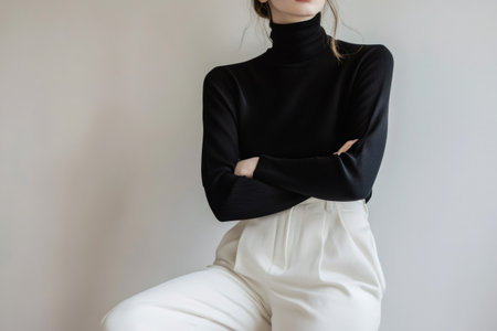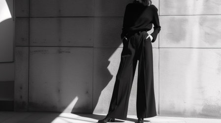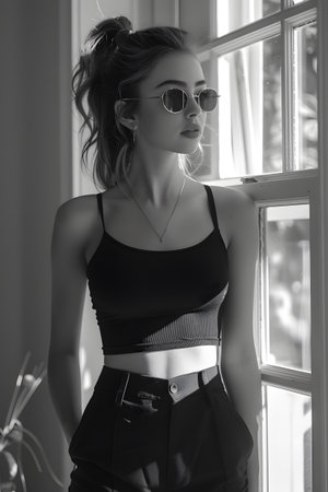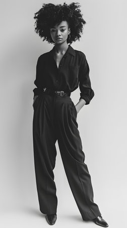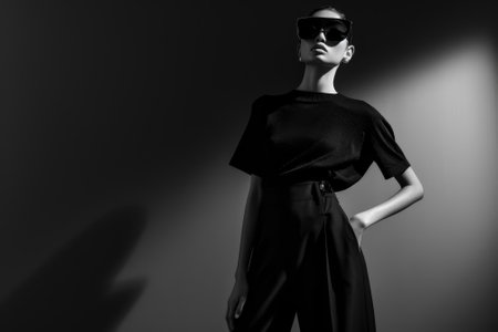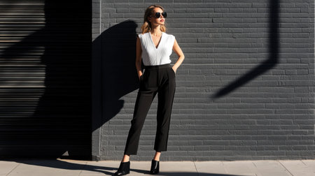 A woman in a black outfit is standing in front of a wall. She is wearing sunglasses and a black shirt