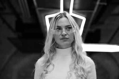 Beautiful fashionable girl sitting in bar near the neon wall, black and white photography