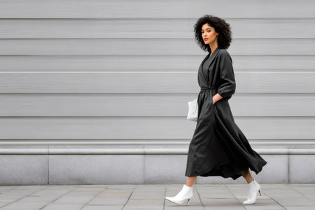 Stylish woman with curly hair walking confidently on a city sidewalk