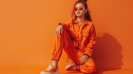 Vibrant Urban Fashion: Trendy Woman Posing in Orange Outfit Against Matching Background