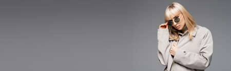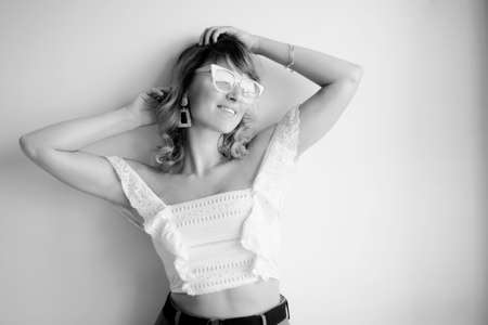 Elegant chic female model in fashion sunglasses. Perfect girl body. Portrait of serious desire woman. Advertising and commercial design. Beautiful charming young attractive woman.