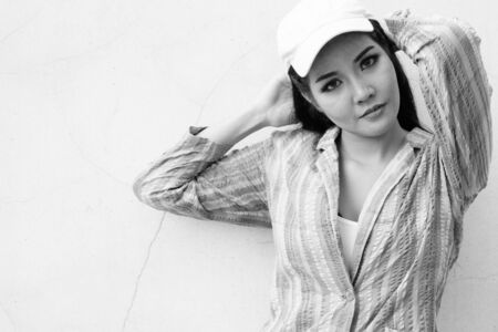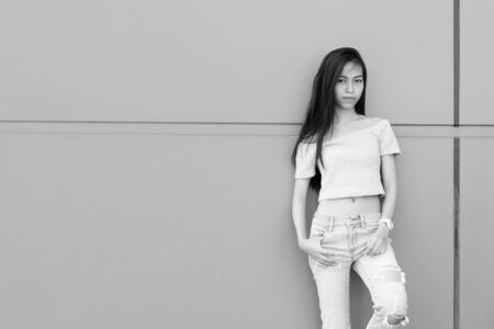 Young beautiful Asian teenage girl posing and leaning against concrete wall outdoors