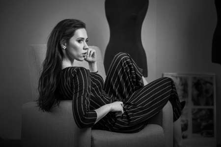 Fashion model, couturier sitting on a chair in the studio sewing clothes, fashion