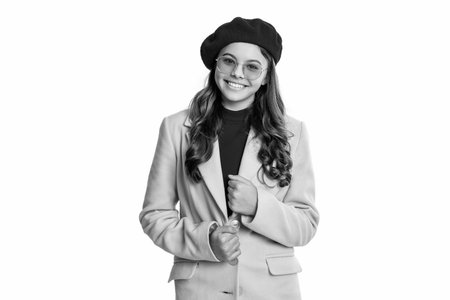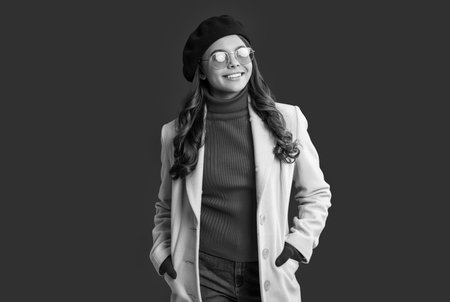 Teen girl wear sunglasses. Autumn fashion girl isolated on white. Trendy and stylish girl smiling. Fall fashion style for teen. Outfit for fall style. Fall fashion. Girl in autumn style