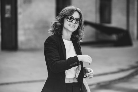 A business woman in a strict black coat and with a clutch in her hands goes out into the city