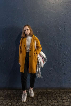 Girl in autumn coat isolated on red. Teen girl wear sunglasses. Autumn fashion girl. Trendy and stylish teenager girl smiling. Fall fashion style for teen. Complete outfit for the fall style