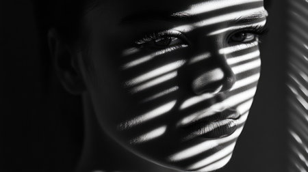 A woman's face is shown in a black and white photo with a shadow cast on her face. The photo has a moody and dramatic feel to it, as the shadow emphasizes the woman's features