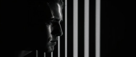 Side profile of a man in a dramatic black and white composition. Striped light patterns create contrast and depth, emphasizing mood and emotion.