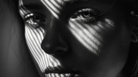 A black and white close-up of a womans partially shadowed face, revealing subtle details and expressions, A face that is partially obscured by shadows, adding an air of mystery