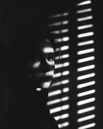 Monochrome portrait of a womans face seen through blinds