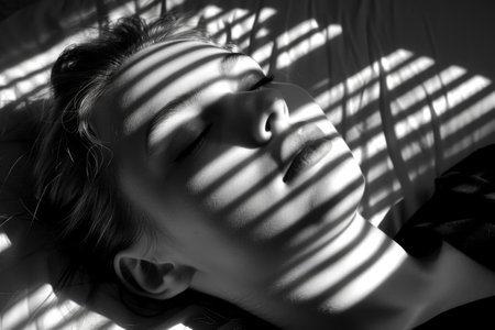 A woman lying on the ground, with sunlight casting striped shadows over her face, conveying a relaxed or leisurely mood